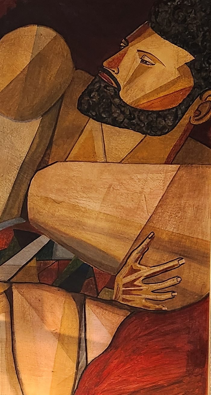 This bold, painting was inspired by Konstantin Somov but taken in a much more abrastract, borderline cubist style.